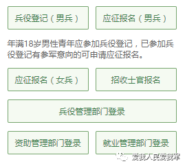 编者语:有些小伙伴看到这么多的菜单就有些懵了,其实不用紧张,如果你是第一次来的男生,直接从“兵役登记(男兵)”进入页面就可以了;否则就从“应征报名(男兵)”进入页面;如果想报名招收士官,就从“招收士官报名”进入页面,不过,今年的招收士官貌似还没开始 -_-!!